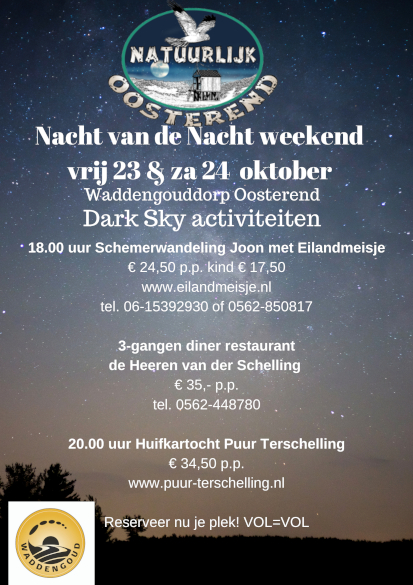 Het is alweer de tiende keer dat Stichting Natuurlijk Oosterend meedoet met de landelijke Nacht van de Nacht die op zaterdag plaatsvindt. Het is alweer de tiende keer dat Stichting Natuurlijk Oosterend meedoet met de landelijke Nacht van de Nacht die op zaterdag plaatsvindt. Gezien de animo van afgelopen jaar bieden ze de belevenissen nu ook op vrijdag aan voor een weekend Nacht van de Nacht ervaring waarbij Dark Sky centraal staat.Deelnemers kunnen mee met de schemerwandeling Joon van Eilandmeisje. Joon is Aasters - Terschellinger dialect - voor avond. Met een vertrek in de schemer, de fase tussen de dag en de nacht die in het verschiet ligt, wandel je als het ware de avond in. De duinen van Oosterend herbergen tal van verhalen, over zandverstuivingen, levende duinen, nachtjagers, drenkelingen, verdwenen akkers en nog veel meer.Er wordt er een drie-gangen diner geserveerd in restaurant De Heeren van der Schelling in sfeervolle setting. Eigenaar en chef-kok Arno van Veen heeft mooie gerechten samengesteld, passend bij de herfst.Daarna staan huifkarren klaar op het erf van Puur Terschelling om naar De Boschplaat te gaan. Een kampvuurtje, warme chocolademelk, marshmallows en een sterrentelkaart maken deze belevenis compleet. De onderdelen zijn te boeken bij de bedrijven. Wees er snel bij want sommige onderdelen zitten al bijna vol!