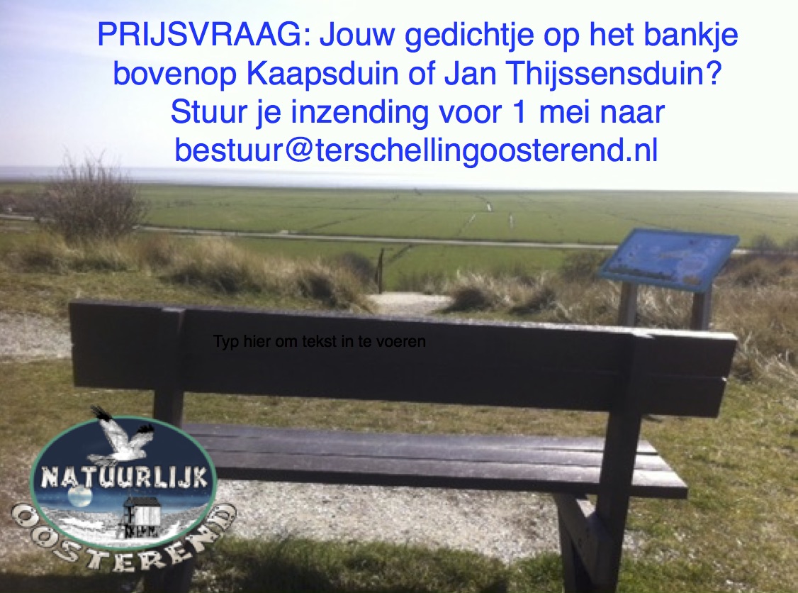 Stichting Natuurlijk Oosterend heeft vorig jaar met hulp van de subsidie Iepen Mienskipfûns Fryslân o.a. een aantal bankjes geplaatst in en rondom Oosterend. Voor de bankjes bovenop Kaapsduin en Jan Thijssensduin zoekt het bestuur nog een passend gedichtje en lanceert daarom een prijsvraag.