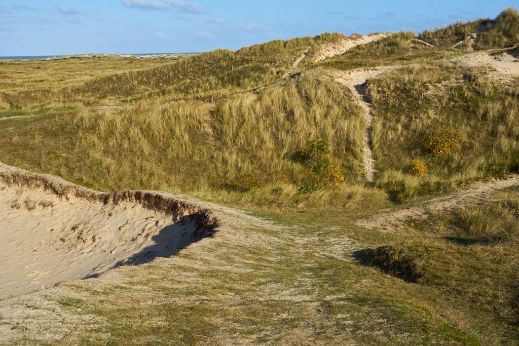 Een doolhof van inhammen om te verdwalen voor de wandelaar die zich in zijn eigen verbeelding klein maakt in dit gangenstelsel, spelend als een kind. Voetsporen verdwijnen onder het stuivende zand wanneer je even wacht. De zee en de stand van de zon bieden houvast te weten waar de uitgang is tussen de grote geplooide reuzen die heimelijk in ontwikkeling zijn. Bovenop de glorieuze toppen ligt zacht zand met jonge helmen. Nieuwe aanwas verrijst zich als een dak van een huis. Wachtend tot ze mogen laten zien of ze de storm aankunnen zodra die zich door de open ruimtes ploegt.